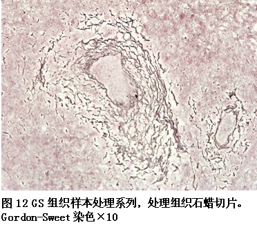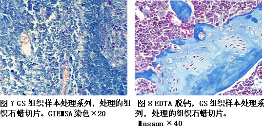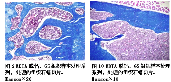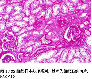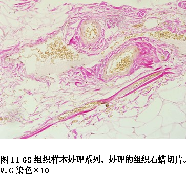 本实验室利用GS处理的组织石蜡切片进行了H.E染色、Giemsa 、PAS、网状纤维 Gordon-Sweet、胶原纤维 V.G和Masson染色。均获得了比较满意的结果(见图3、4、5、6、7、8、9、10、11、12、13)。