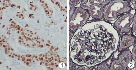 图1乳腺癌ER ( + ) GS制片 图2 肾穿刺PASM (+) GS制片