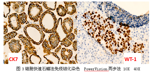 用细胞蜡块制备的切片细胞数目明显增多,尤其是肿瘤细胞,组织结构完整,切片厚薄均匀,与常规组织切片相比,无明显差异。对诊断为癌的细胞蜡块进行免疫组化鉴别诊断,染色结果均能较好的表达。如图1为同一例标本的两种不同做法;图2为细胞蜡块快速石蜡法;图3为快速石蜡细胞蜡块免疫组化染色