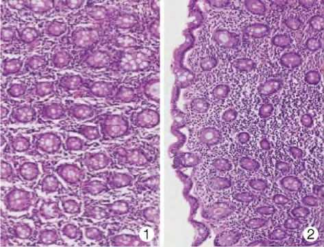 送检的大组织病理标本,经病理医师模拟结肠镜在每份标本的相同部位钳取2份,随机分为1h组和常规 组。1 h脱水程序:4%甲酸1 min, 85%乙醇1 min和6 min (55℃),乙醇/异丙醇混合液(4:1) 1 min和6 min (55℃ ),异丙醇 1 min X2,异丙醇 12 min (55℃),石蜡 20 min 和 5 min (85℃),石蜡1 min (65℃)。常规脱水程序(略)。程序完成 后,分别进行石蜡包埋,3 ~4 μm切片,GS环保型试剂HE染 色,GC-)2封片胶封固。