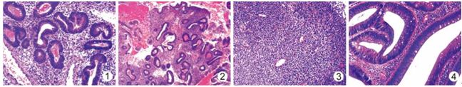 图1子宫内膜组织 图2子宫内膜组织 图3淋巴结穿刺活检组织 图4肠活检组织