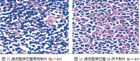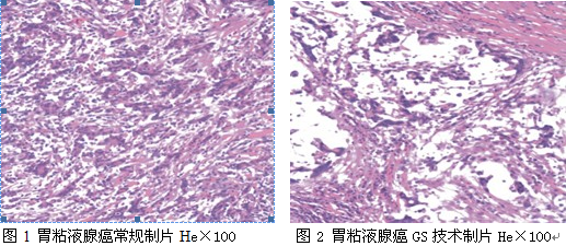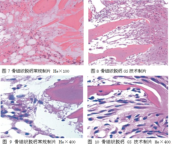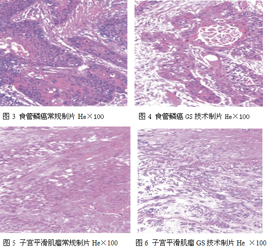 2.1 同一例标本二种不同脱水方法的HE染色比较同一例标本采用二种不同脱水方法的组织块在包埋时就感觉到不一样,常规脱水、透明的组织块脆硬,包埋时易碎裂;GS标本组织固定脱水套装试剂处理的组织块软硬适中便于包埋。在切片时不论组织大小环保试剂处理的组织块也更好切,特别是肌瘤、皮肤和骨组织等坚硬的组织块比常规脱水的组织块更容易切片。同一例标本二种不同脱水方法的切片同一染色架进行HE染色,GS组织标本固定脱水套装试剂处理的切片组织红蓝适度、核浆对比分明,色彩鲜艳、结构显示清晰,明显优于传统方法制片的HE染色(图)。