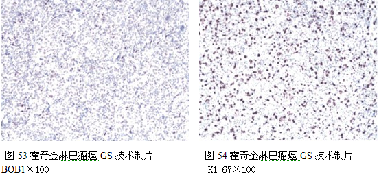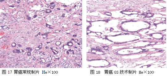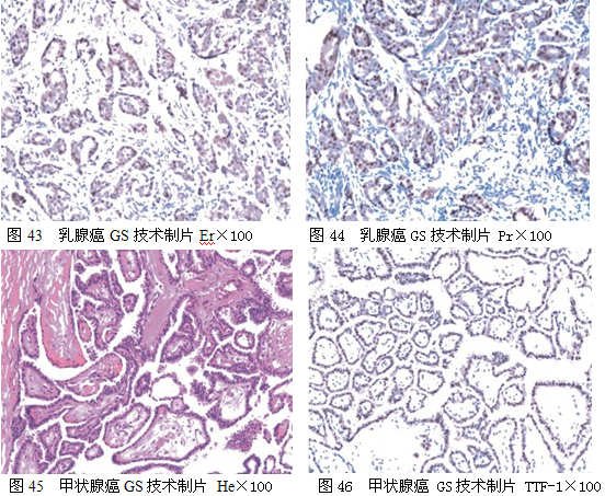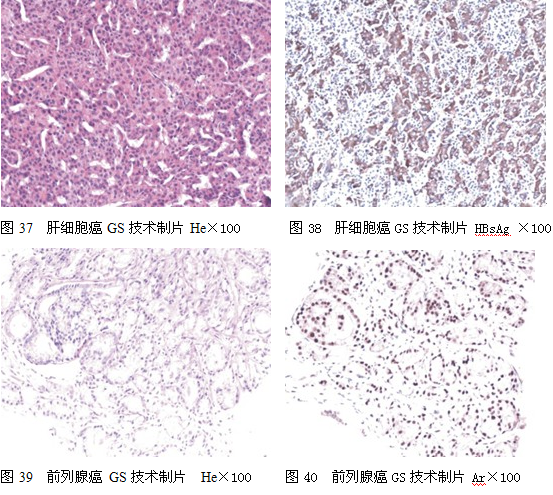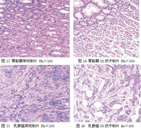2.3 大批量应用于格林标本组织固定脱水套装试剂制片结果 经过一周107例标本二种不同脱水方法的组织切片HE染色和免疫组化染色比较,3位教授和2位主治医师阅片后一致认为均优于常规脱水的切片,于是展开了24周的GS标本组织固定脱水套装试剂大批量应用,每天将上午取材的102个组织块放入装有GS组织标本固定脱水套装试剂的另一台SHANDON全自动组织处理机,无论是HE染色还是免疫组化染色都取得了满意的结果,日常病理诊断工作未受任何影响(图)。