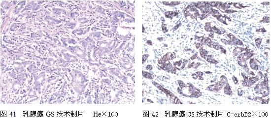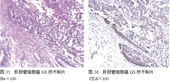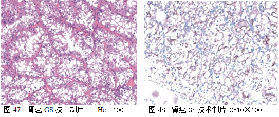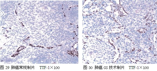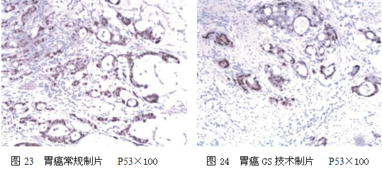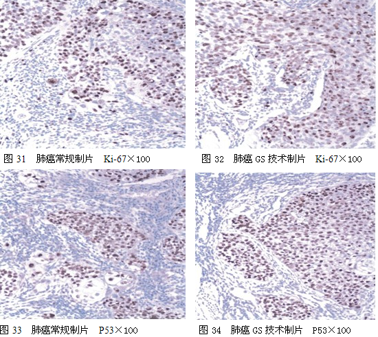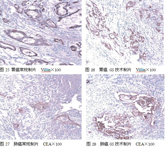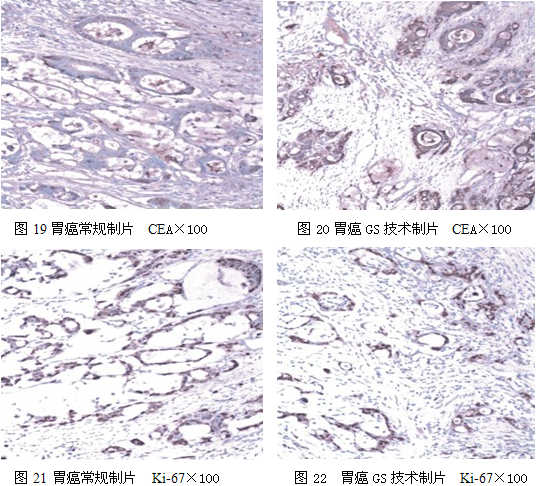 2.2 同一例标本二种不同脱水方法的组织切片免疫组化染色比较 在107例标本中有胃癌、食管癌、肾癌、肝癌、肠癌、乳腺癌、胶质瘤、淋巴瘤等26例,对其进行了38项抗体共176个指标的免疫组化对比染色,两者免疫组化染色结果是相符的,无论是阳性表达部位还是阳性细胞数都没有明显差别,部分GS标本组织固定脱水套装试剂处理的切片免疫组化结果阳性细胞表达显著、定位准确、背景也清晰,要优于常规脱水处理的切片(图)。